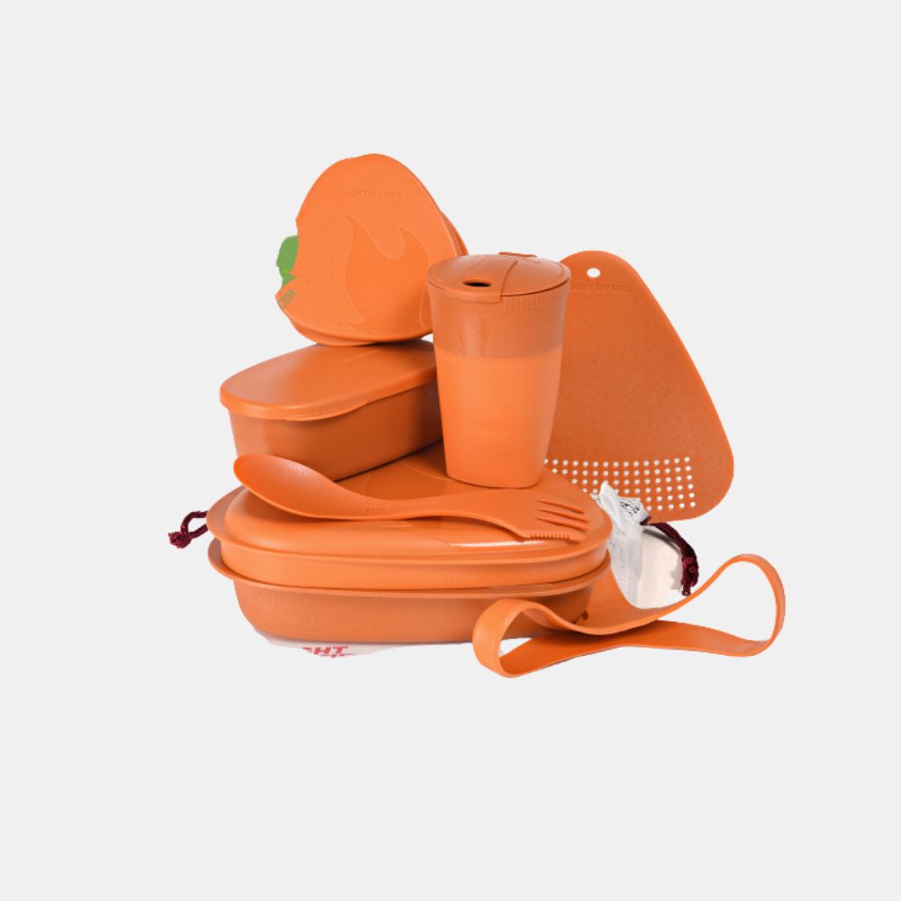 Designed especially for Light My Fire by Scandinavian designer Joachim Nordwall, the MealKit BIO is a handy all-in-one meal kit. The kit includes 1 lid that functions as a plate (500 ml), 1 deep bottomed bowl that also functions as a plate (900 ml), 1 SnapBox Original (170 ml) food storage container, a SnapBox Oval (320 ml) storage container, 1 Pack-up-Cup (260 ml), 1 cutting board/strainer, and 1 Light My Fire Spork Original. It also includes a harness to keep the kit all together. Tight-fitting, snap-lock lids keep contents inside the waterproof SnapBoxes instead of all over your bag, and the internal measuring lines allow you to bring only what you need. The Pack-up-Cup expands when you are ready for a hot or cold drink and collapses when the meal is over while the versatile cutting board/strainer lets you chop your vegetables and strain the pasta when it’s done cooking. And when dinner is ready, just use the plate and bowl to eat a delicious meal with the Spork original that’s a combo spoon-fork-knife. The beauty of this kit is that it all nests inside itself for a compact and multi-purpose mess kit. Lastly, all components are dishwasher and microwave safe, and are made from Biobased plastics that are 100% BPA-free. This makes the kit versatile to use as a lunchbox for school or work.